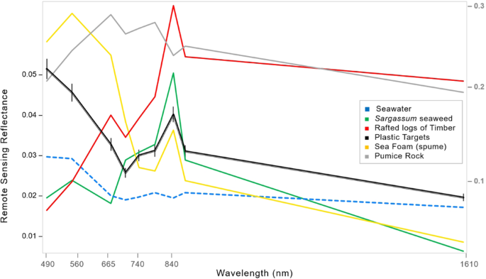 Satellites collecting optical data offer a unique perspective from which to observe the problem of plastic litter in the marine environment, but few studies have successfully demonstrated their use for this purpose. For the first time, we show that patches of floating macroplastics are detectable in optical data acquired by the European Space Agency (ESA) Sentinel-2 satellites and, furthermore, are distinguishable from naturally occurring materials such as seaweed. We present case studies from four countries where suspected macroplastics were detected in Sentinel-2 Earth Observation data. Patches of materials on the ocean surface were highlighted using a novel Floating Debris Index (FDI) developed for the Sentinel-2 Multi-Spectral Instrument (MSI). In all cases, floating aggregations were detectable on sub-pixel scales, and appeared to be composed of a mix of seaweed, sea foam, and macroplastics. Building first steps toward a future monitoring system, we leveraged spectral shape to identify macroplastics, and a Naïve Bayes algorithm to classify mixed materials. Suspected plastics were successfully classified as plastics with an accuracy of 86%.